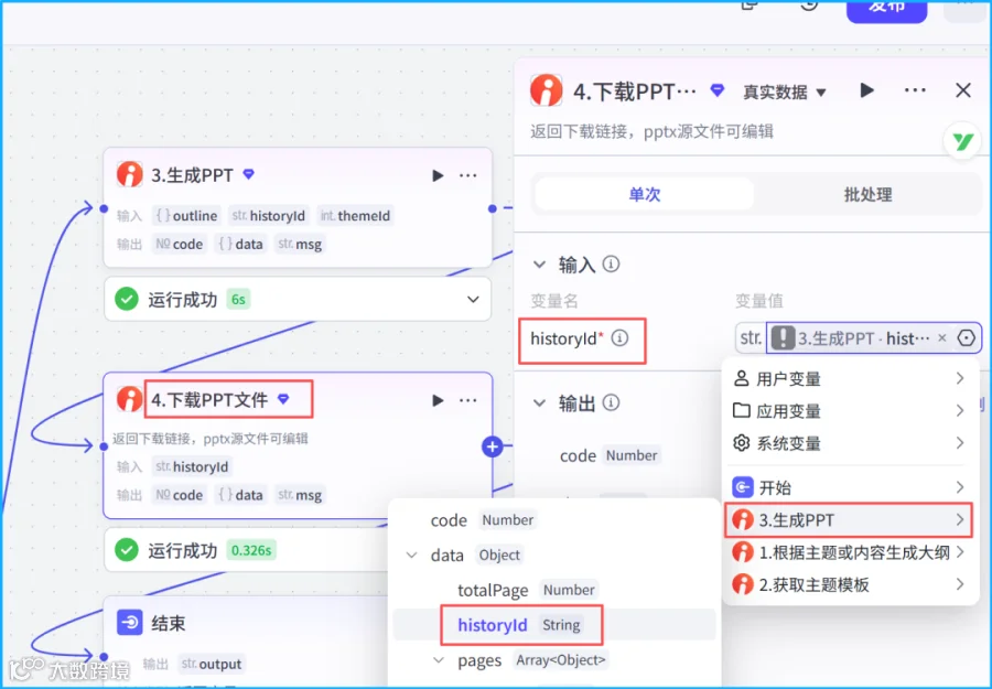 插件默认的变量名称为historyld,引用“3.生成PPT”节点输出的变量historyld。