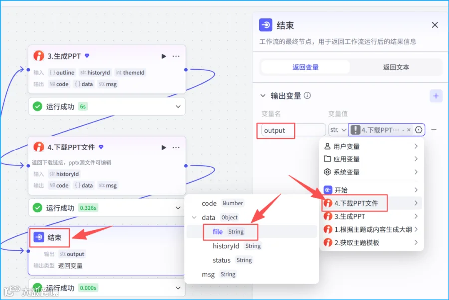 设置结束节点默认变量ouput,引用“4.下载PPT文件”节点输出的file变量。