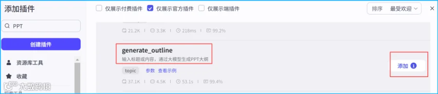 作用:利用这个插件中内置的大模型,传入标准大纲,结合主题模板生成PPT,返回PPT名称、总页数、首页图、单页缩略图等等功能。