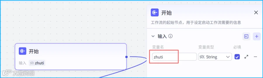 插件默认的变量名称为topic,引用开始节点输入的主题变量zhuti。