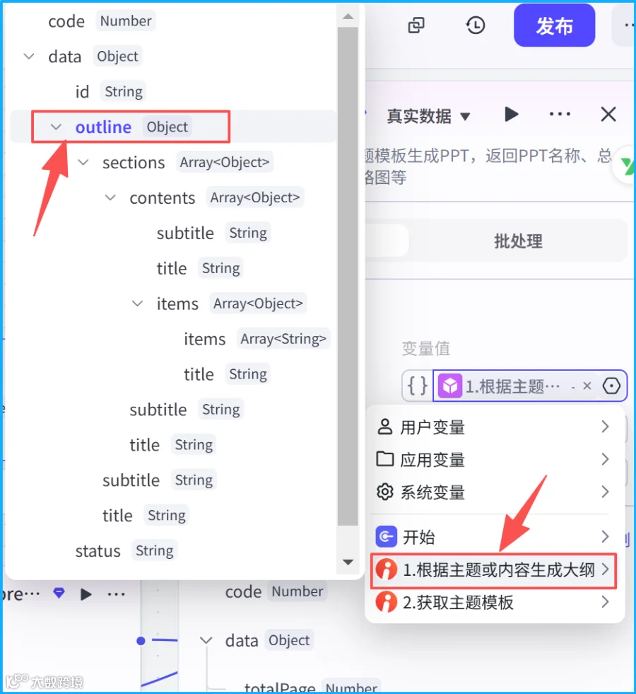 插件默认的变量名称为outline,输入大纲内容,即引用“1.根据主题或内容生成大纲”节点输出的对象object格式主题变量outline。