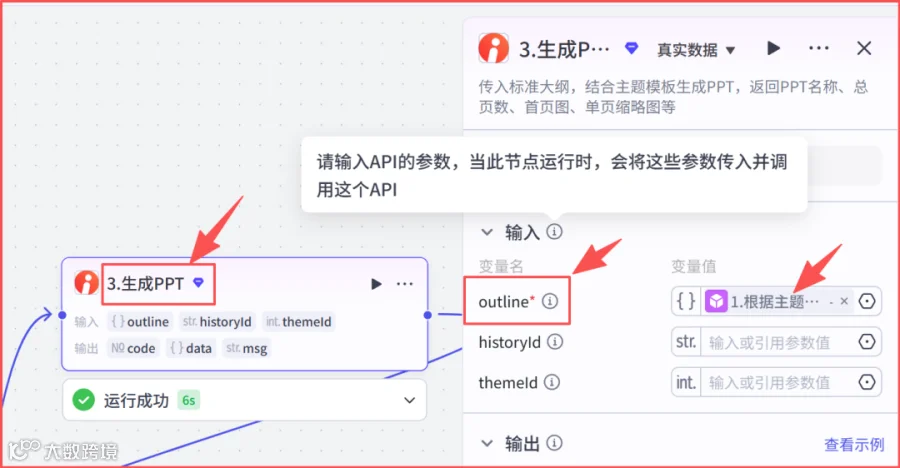 作用:通过开始节点输入的标题或内容,利用这个插件中内置的大模型,生成PPT大纲。