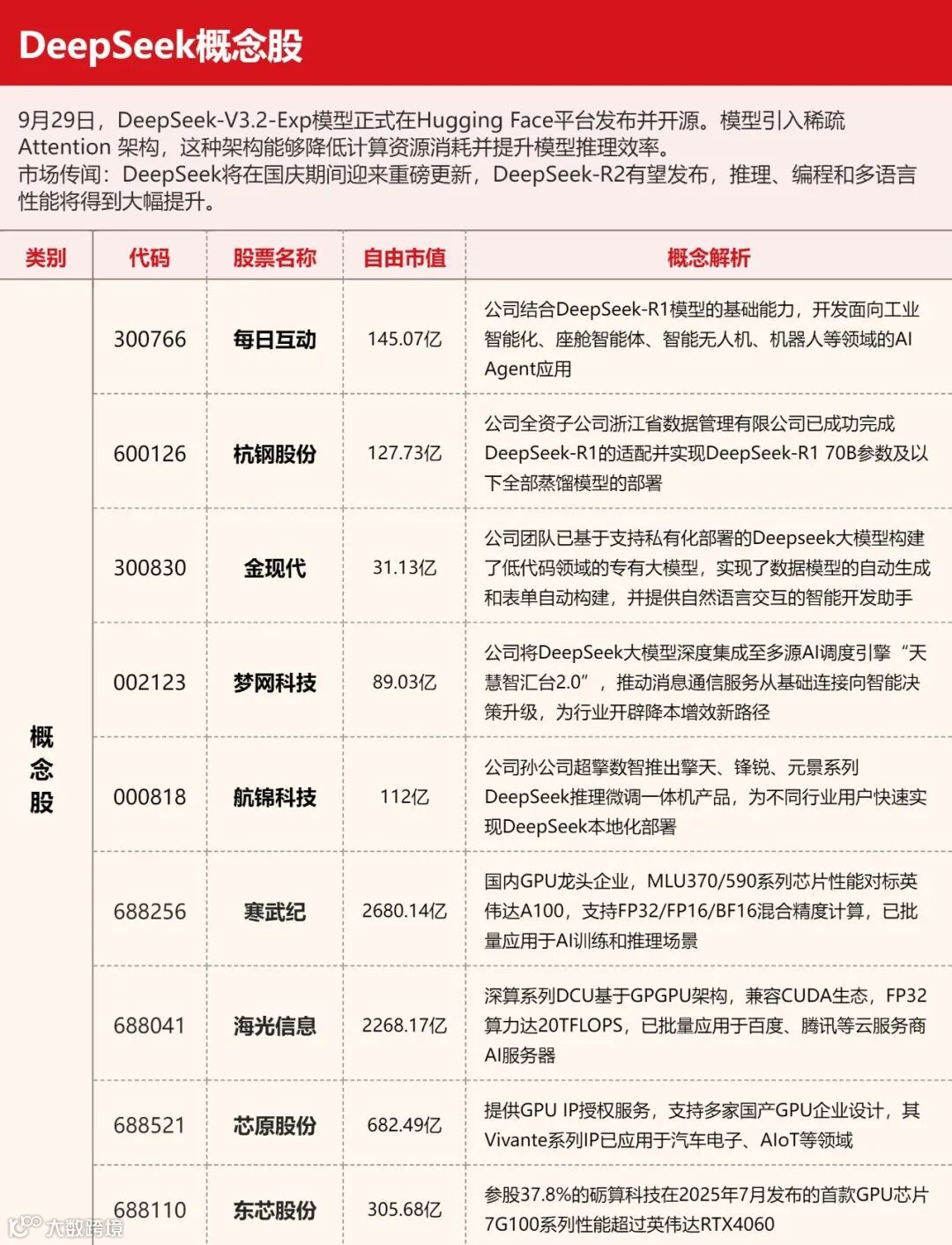 DeepSeek-V3.2-Exp官宣发布,API价格下调超50%,值得关注的是deepseek官微是18:07发的消息,寒武纪官微18:11分发了适配消息,华为计算官微19:31分发了昇腾0Day支持DeepSeek-V3.2-Exp的通知。这对于DS概念和国产算力是一个重要催化,晚上很多机构都有研报覆盖。有机构解读认为,这是国产模型芯片国庆献礼。