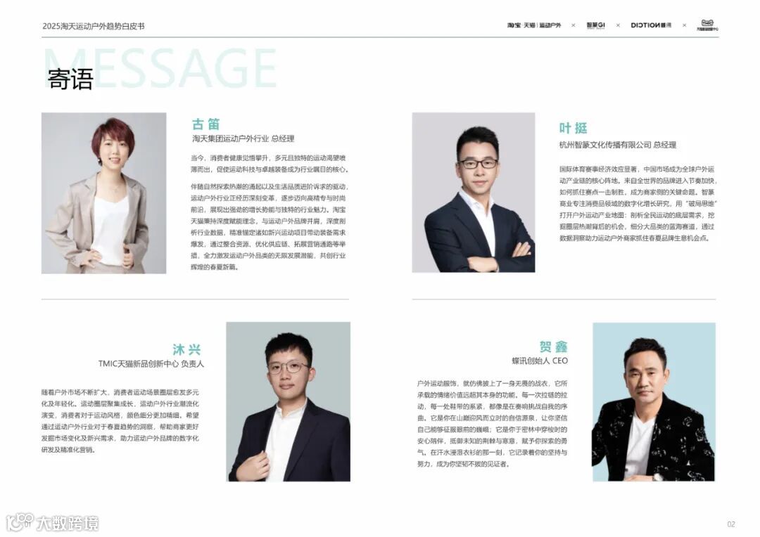 《2025春夏淘宝天猫运动户外趋势白皮书》由淘宝天猫运动户外事业部、TMIC天猫新品创新中心、智篆GI和蝶讯共同发布,旨在分析2025年春夏季节运动户外行业的市场趋势、消费者行为和产品创新方向。以下是对这份白皮书的核心内容解读: