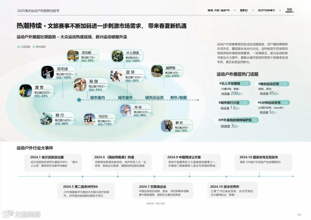 - 运动户外圈层社媒趋势:运动户外相关话题在社交媒体上的热度持续上升,如瑜伽、露营等话题的阅读量和笔记数显著增长。