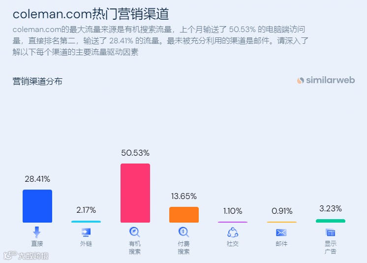 根据similarweb数据显示,Coleman官网的流量主要来自于自然搜索流量(50.53%)、直接访问流量(28.41%)和付费搜索(13.65%)。