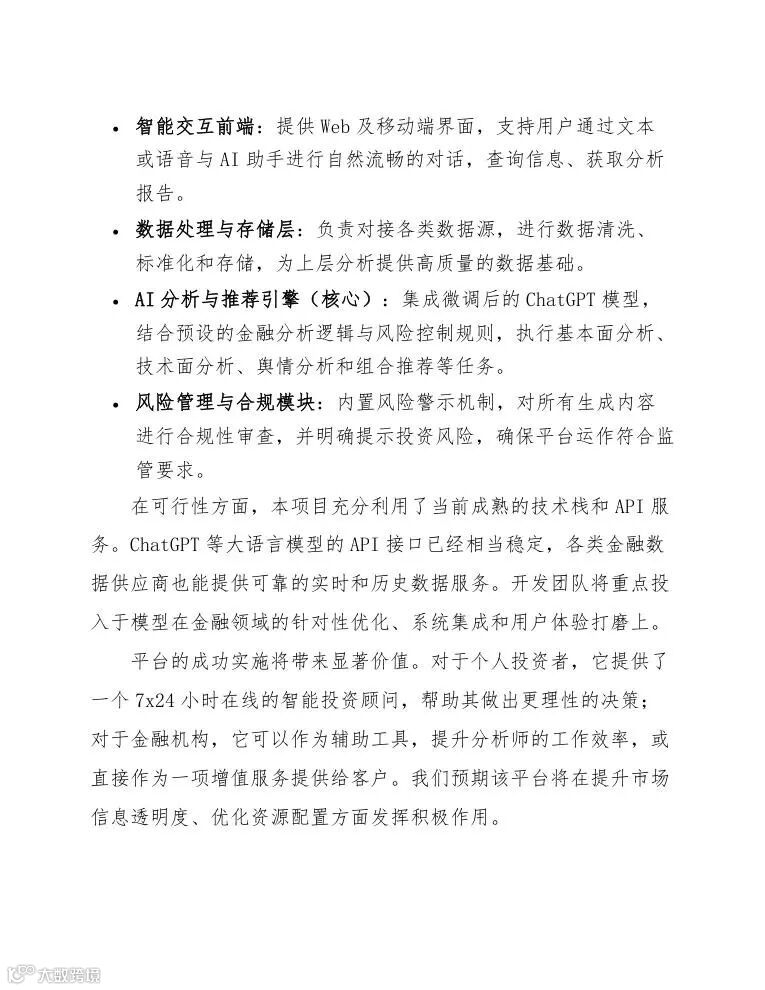 AI分析与推荐引擎(核心):集成微调后的ChatGPT模型,结合预设的金融分析逻辑与风险控制规则,执行基本面分析、技术面分析、舆情分析和组合推荐等任务。 -