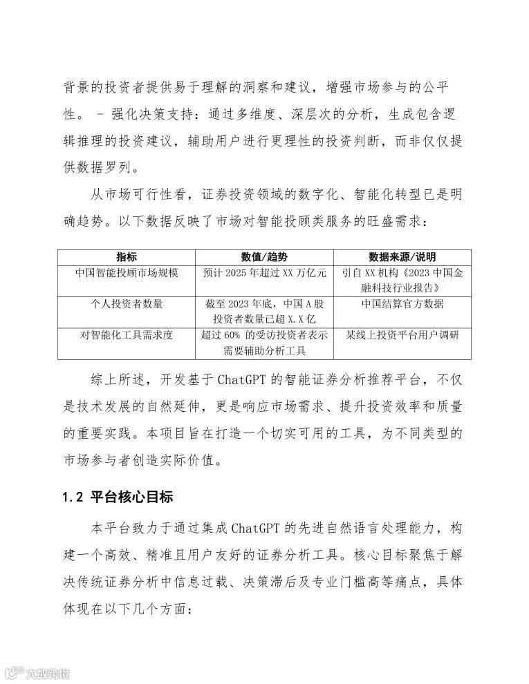 综上所述,开发基于ChatGPT的智能证券分析推荐平台,不仅是技术发展的自然延伸,更是响应市场需求、提升投资效率和质量的重要实践。本项目旨在打造一个切实可用的工具,为不同类型的市场参与者创造实际价值。