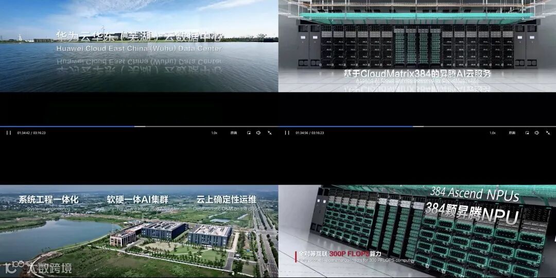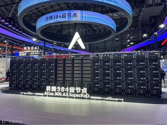 在发布910c同时,华为也震撼发布基于昇腾 910c “CloudMatrix 384 超节点” ,在算力规模和推理性能上比肩英伟达 NVL72 。整个CloudMatrix 384共有12个机柜,每个机柜4个910C节点,每个节点包含8颗910C,从而组成一个拥有384颗910C的超级算力解决方案。相比于NVL72的单机柜解决方案,华为的CloudMatrix 384共包含16个机柜。除上面提到的12个计算节点机柜,还包含4个用于节点互联的网络机柜,组成一个庞大的计算集群。
