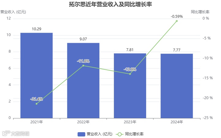 近三年营收及增长率: 拓尔思近三年营业收入总体呈下降趋势。2021年公司实现营业收入约10.29亿元,同比下降21.4%;2022年营业收入9.07亿元,同比下降11.8%;2023年营业收入7.81亿元,同比下降13.9%。受宏观环境和行业需求放缓影响,公司营收连续下滑。进入2024年,营收降幅收窄,全年实现营收7.77亿元,同比仅略降0.59%。2025年上半年,公司营收为2.45亿元,同比下降38.36%,主要因上年同期基数较高(2024年上半年有一次性大额收入)所致。整体来看,公司营收规模较峰值有所回落,但近期降幅已明显收窄,业务趋于企稳。下图展示了公司近三年的营业收入及同比增长率。