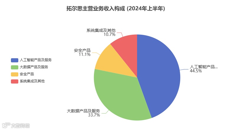 业务板块分布及营收占比: 按产品类型划分,拓尔思的收入主要来自人工智能软件产品及服务、大数据软件产品及服务、安全产品,以及系统集成等其他业务。以2024年上半年为例,人工智能产品及服务收入占比约44.5%,大数据产品及服务占33.7%,安全产品占11.1%,系统集成及其他占10.7%。下图直观展示了公司2024年上半年的收入构成。