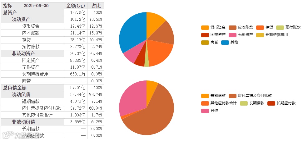 资产状况:公司总资产为137.55亿元,较上年末增长3.92%。需要关注的是,公司应收账款体量巨大,占最新年报归母净利润的比例高达7573.43%,回款压力较大。