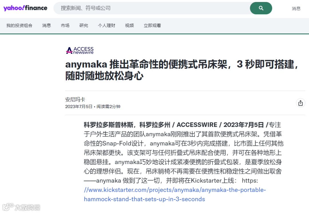 2023年新品上市之际,该品牌利用全球通稿宣发造势。随后该稿件还转载至Yahoo金融板块,不仅丰富了品牌的谷歌收录页面,还巧妙利用顶媒的权威影响力为品牌代言。