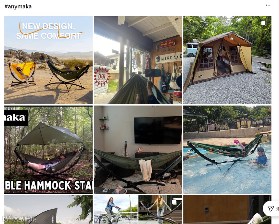 在平台选择上,anymaka也侧重选择用户圈层更偏向年轻一代的ins。其官方自营账号通过发布场景化营销海报、用户真实反馈,将吊床与海滩,山丘,草地多元场景融为一体,侧面展示产品不受场地限制的特性。