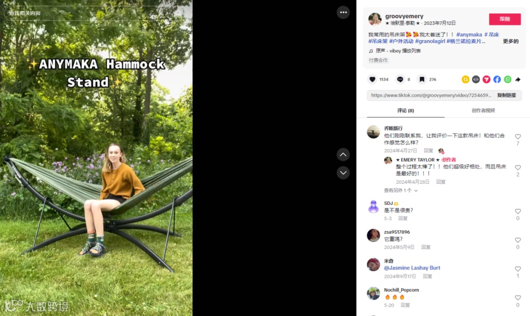 在另一个用户圈层同样偏向年轻化的社媒平台-TikTok,anymaka也利用红人合作内容为受众触达提供抓手。例如名为“groovyemery”的小型红人发布anymaka的试用视频后,收获点赞量超1000次,评论区更是有网友现场寻求购买建议。