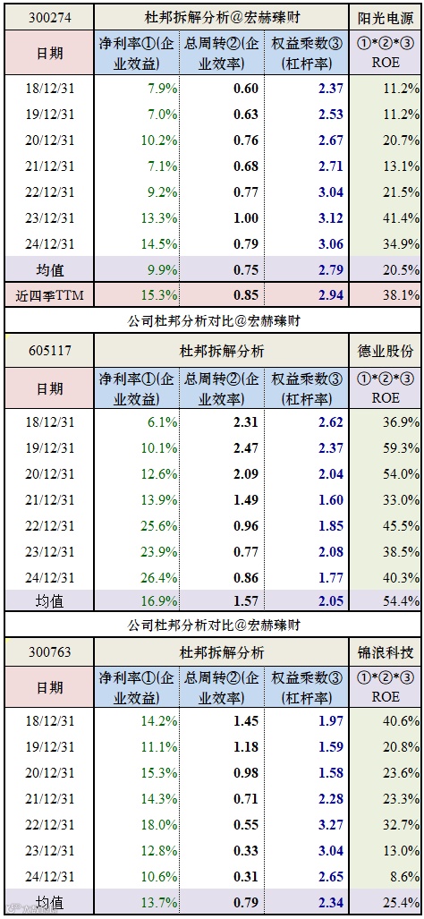 整体业务德业毛利率和净利率最高,阳光电源是全球化龙头,覆盖180+国家,德业聚焦新兴市场(非洲,中东和工商储),锦浪专注户用分布式市场。杜邦态势看,德业当前较优。