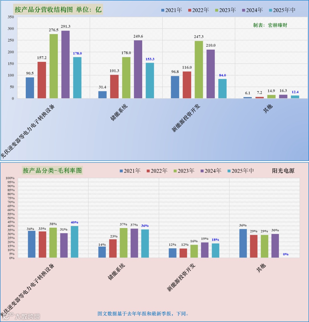 阳光电源,三大业务权重分别为41%、35%、19%;毛利率分别为40%、36%、18%。2024年境内业务占比53%,境外47%。