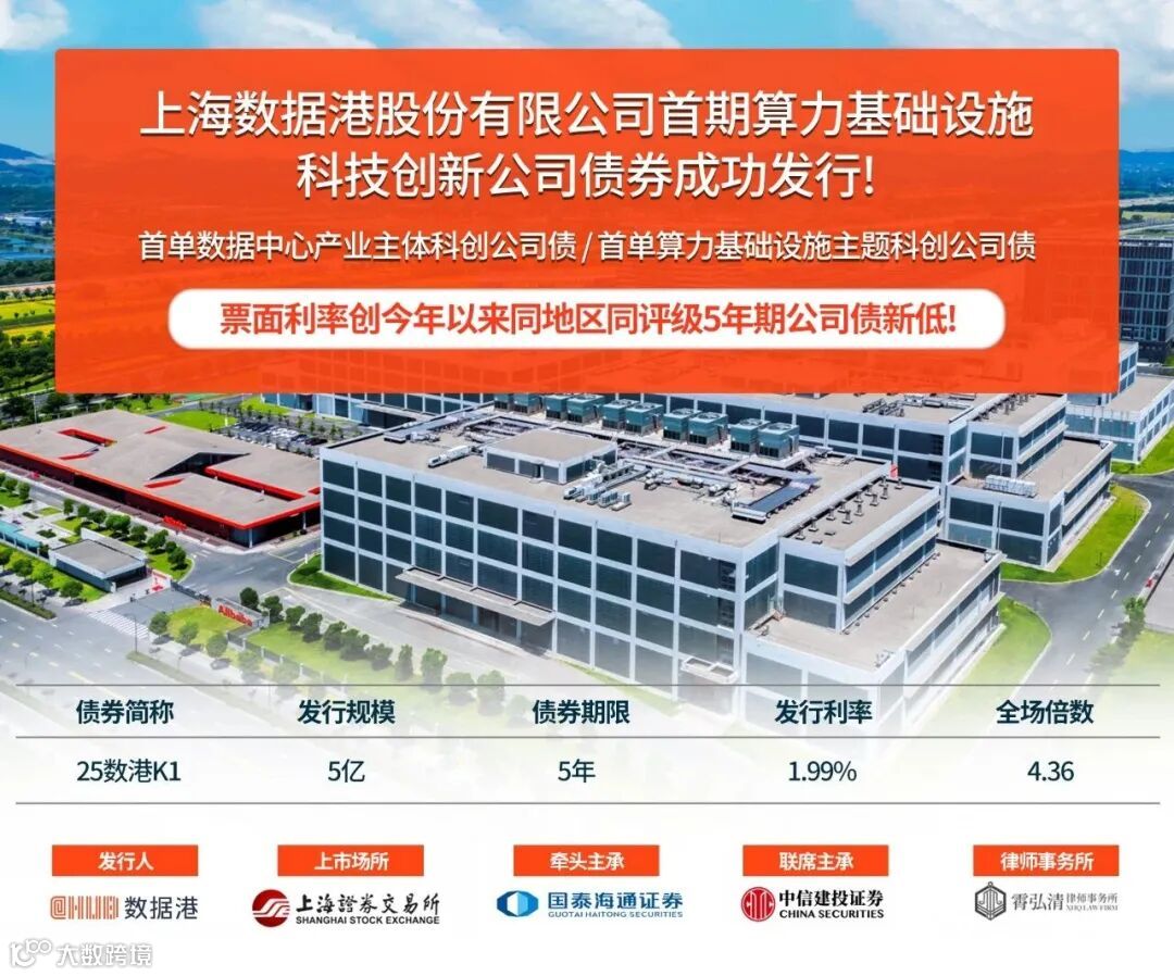 今年8月,数据港完成“2025年面向专业投资者公开发行科技创新公司债券(算力基础设施)(第一期)”发行工作,正式登陆交易所公司债市场。此次发行创下多项市场里程碑:不仅是数据港首单公司债,更是全市场首单数据中心产业主体科创债及算力基础设施主题科创债。在近期市场波动加剧的背景下,该利率仍创下2025年以来同地区同评级5年期公司债新低,充分彰显了资本市场对公司算力基础设施布局及发展前景的高度认可。
