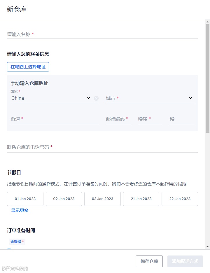 - 一个仓库建议不超过3个配送方式,多添加仓库更便于管理。