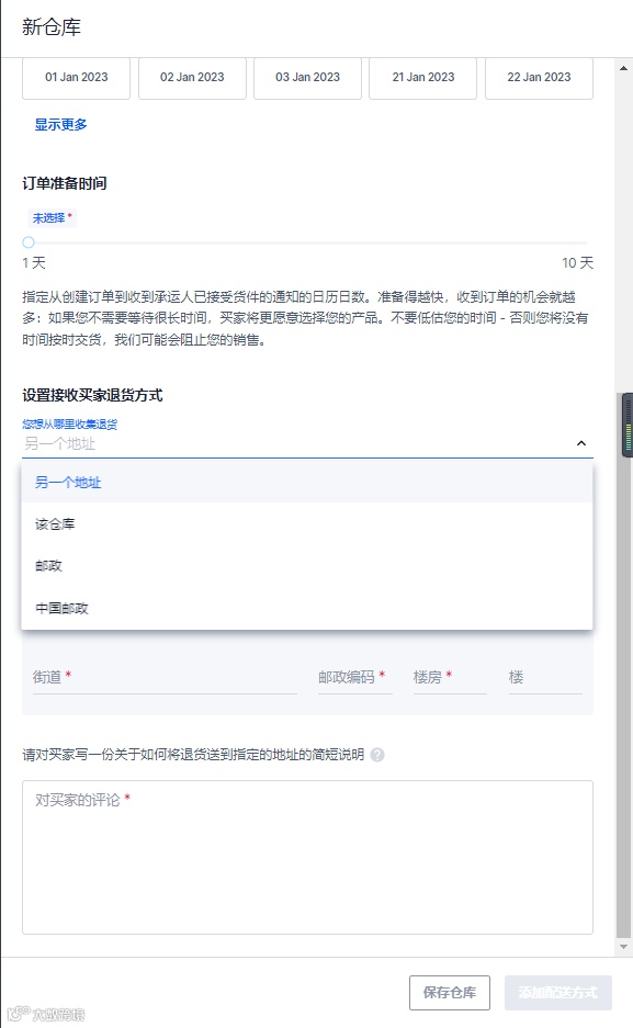 - 退货方式:选择【另一个地址】或【该仓库】,并注明俄语退货说明。