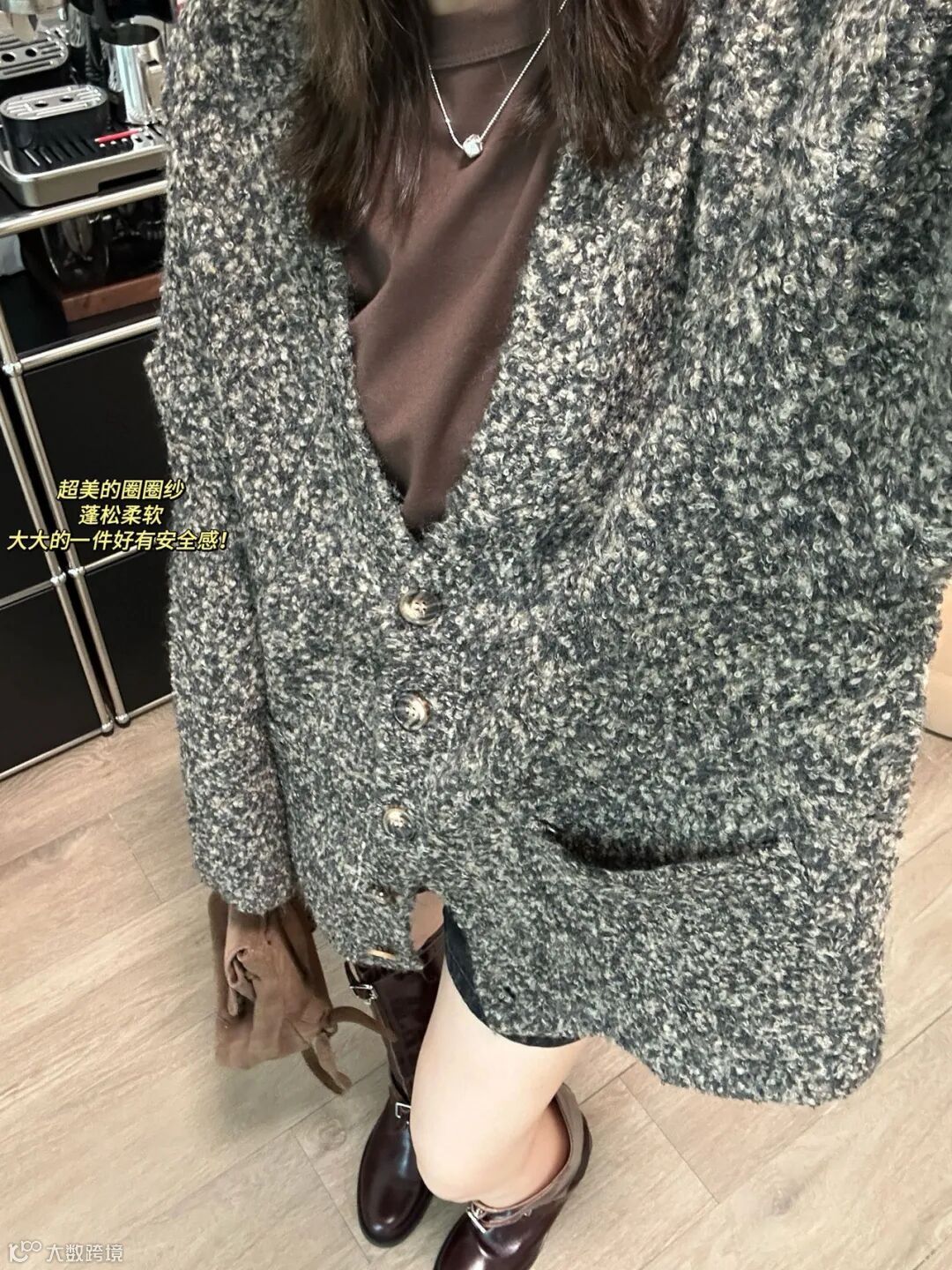 复古又好看的花纱棕,有点绿调棕调在里面 非常适合秋冬搭配,搭配定制琥珀纹理纽扣,视觉上一体成型 自然慵懒,搭配上面料蓬松柔软的小圈圈纱 绵密的肌理感