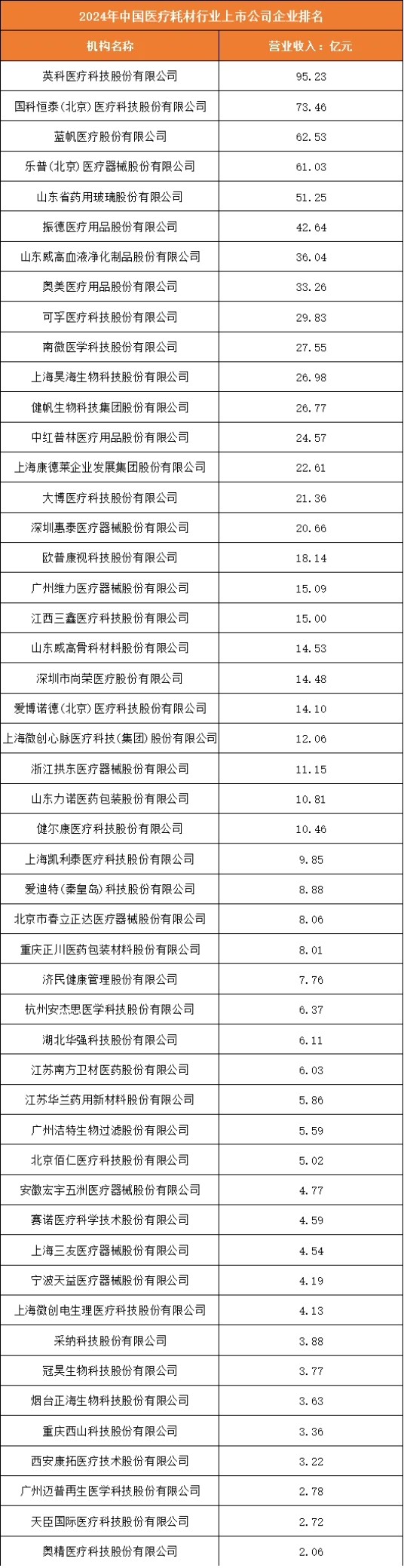 根据申万行业分类,2024年中国医疗耗材行业上市公司按营业收入排名如下:
