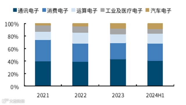 公司产品下游应用领域主要集中于通讯、消费、运算、工业及医疗和汽车电子。公司 2023年度营业收入按市场应用领域划分情况:通讯电子占比 43.9%、消费电子占比 25.2%、运算电子占比 14.2%、工业及医疗电子占比 8.8%、汽车电子占比 7.9%。