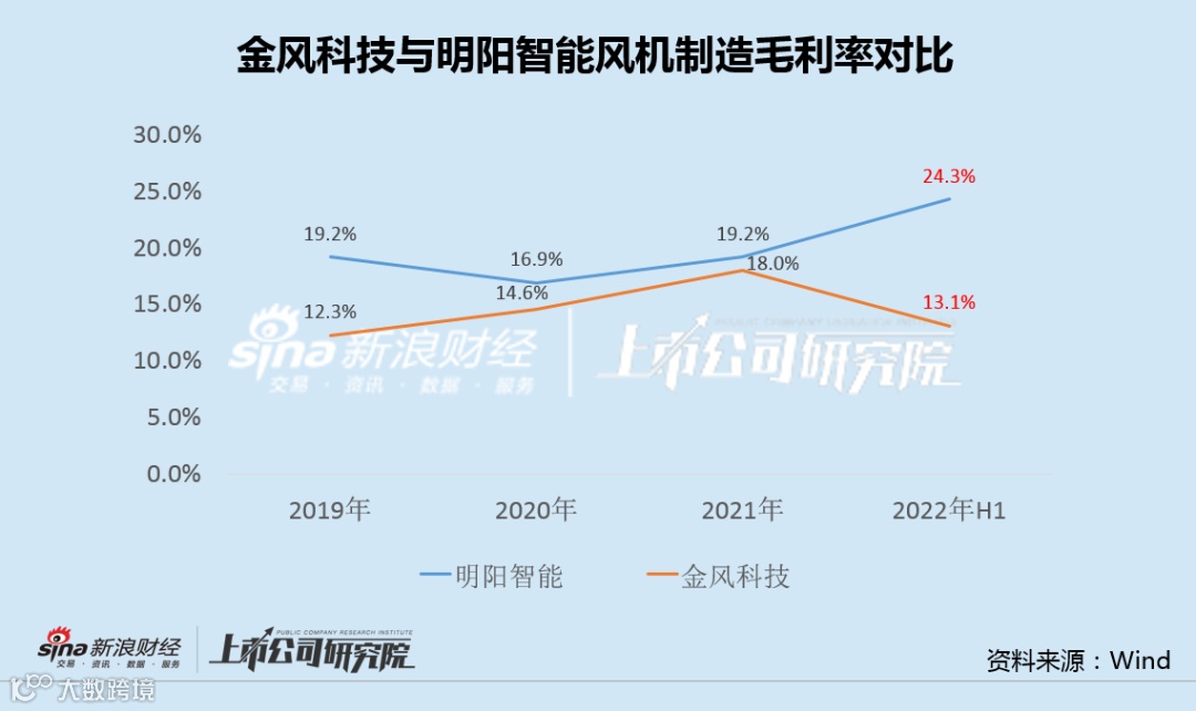 数据显示,2019年至2021年,金风科技风机制造业务的毛利率均低于明阳智能;今年上半年,受补贴退坡后国内风机价格显著下降等因素影响,金风科技风机制造毛利率骤降至13.1%,而明阳智能该业务的毛利率却继续上行。
