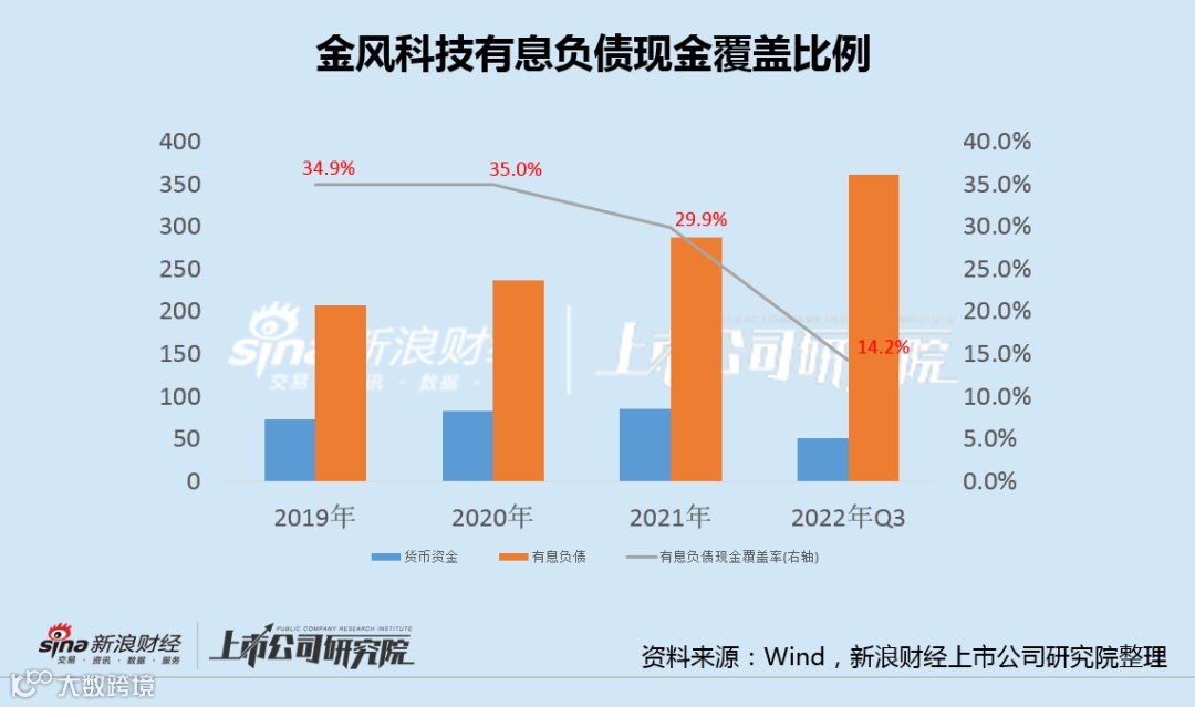 受上述变化影响,金风科技有息负债的现金覆盖比例,从2019年和2020年的35%左右,降至2021年不到30%,今年前三季度进一步大降至仅14.2%。