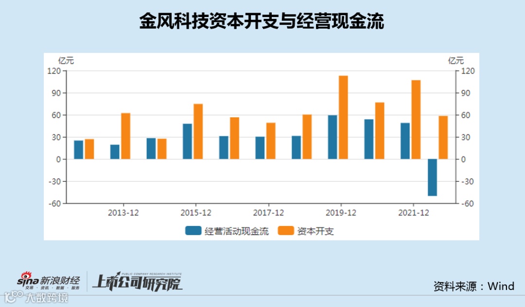 Wind数据显示,近10年来,金风科技仅在2014年的经营活动现金流与同期资本开支金额相仿,其余年份均有较大差距。