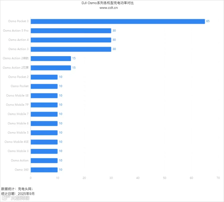 将各系列产品的充电功率绘制为柱状图,可以看到,Osmo Pocket 3产品理论上可支持65W快充,最快16分钟充满80%电量。Action 3、4、5系列充电功率可达30W,其余大部分设备则维持在10W充电功率。
