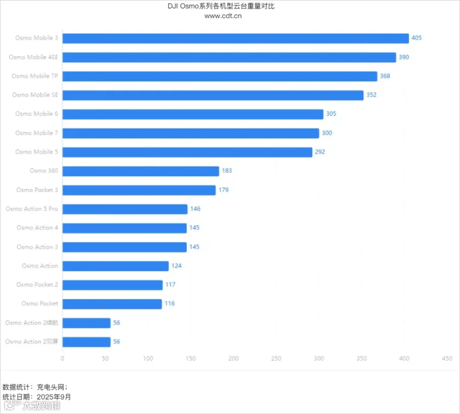 将各系列产品的云台重量绘制为柱状图,可以看到,Osmo Mobile 3 灵眸手机云台重量排名第一,达405g;同时,其他云台或可搭配磁吸手机夹、内置三脚架等设备,重量更一步增加;而Action系列运动相机以便携、易携带特性,最轻为56g。