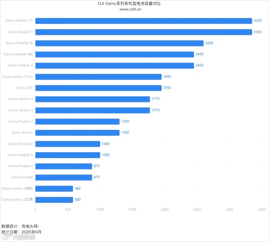 将产品电池容量绘制为柱状图,可以看到,Osmo Mobile 7手持摄影系列稳定器电池容量达3350mAh,且该系列电池容量稳居前列;而Action运动相机产品电池容量较小,最小为Action2续航/双屏产品的580mAh,但可搭配1300mAh容量的模块,续航更持久。