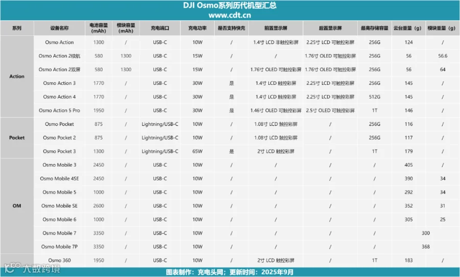 从统计表格中得知,Osmo家族已有Action、Pocket、OM及360等细分系列产品,除摄像机、云台等品类外,更有多种磁吸模块、快拆模块等设计,操作上拥有前置、后置摄像触摸屏,大屏操作更简易、直观;同时,存储卡容量最高可支持到1TB,录制更多素材。