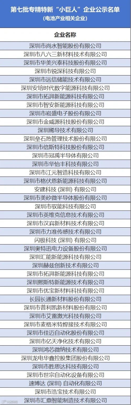 10月20日,深圳市中小企业服务局公示了2025年深圳市第七批专精特新“小巨人”企业名单及,协会梳理总结了其中的电池产业相关企业名单,共有43家企业上榜,2025专精特新“小巨人”复核通过企业36家,展现了深圳企业在新能源与先进制造领域的创新实力与竞争优势。
