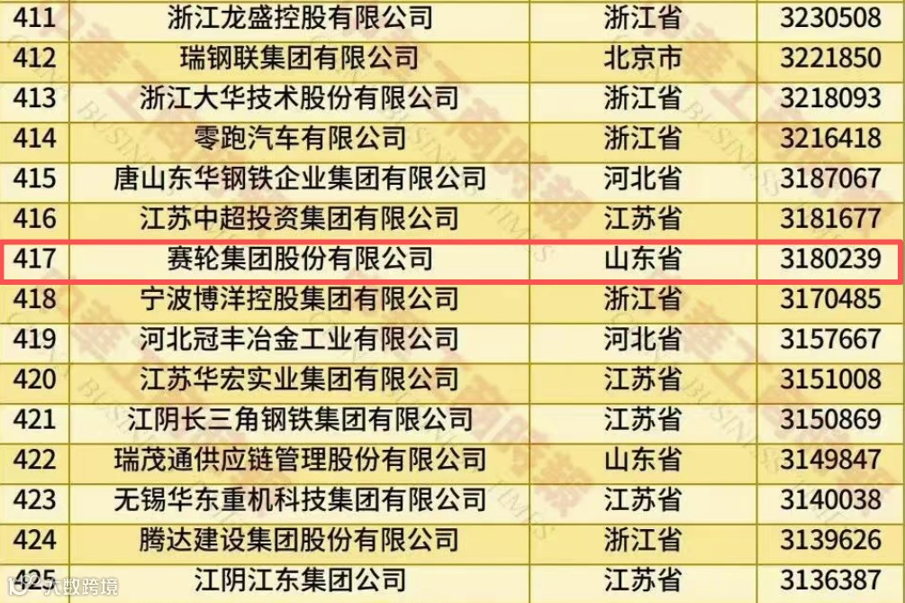 赛轮集团入选2025中国民营企业500强榜单,位列第417位,品牌价值连续八年提升。