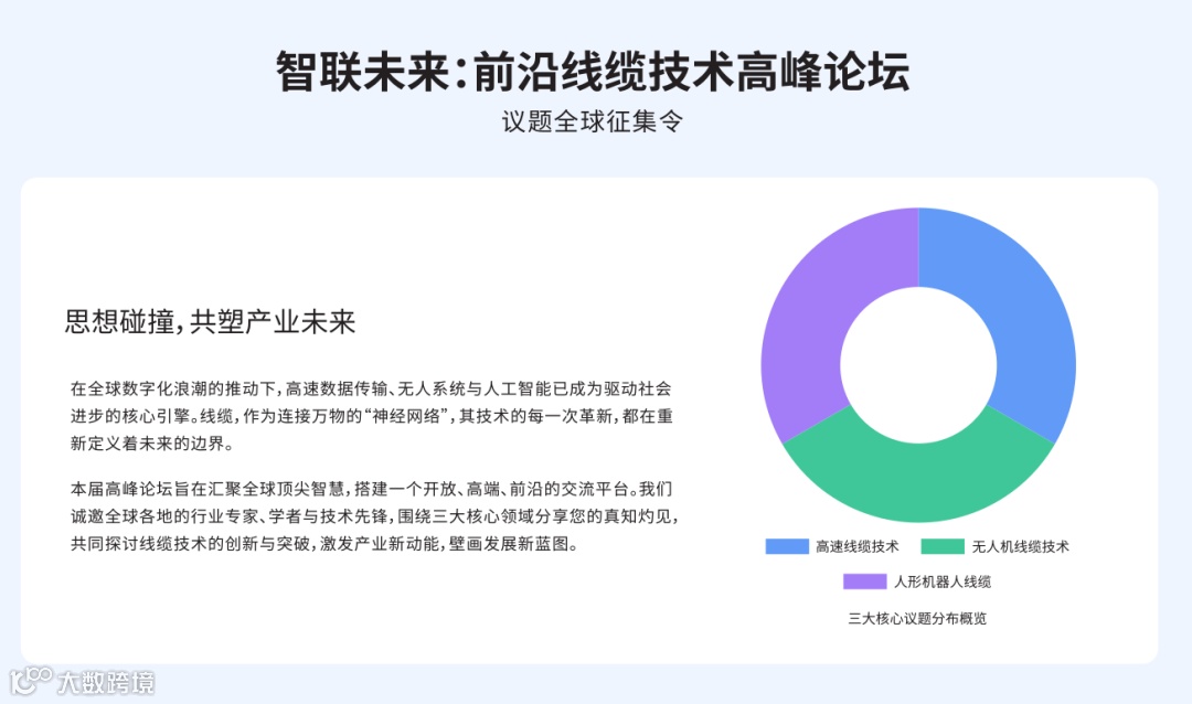 大会以“智联未来・缆聚势变”为理念,现公开征集行业讲师,共筑技术交流平台,分享前沿成果,碰撞创新思路,助力推动国内线缆企业高质量发展,逐步迈向高端化、智能化新思路。