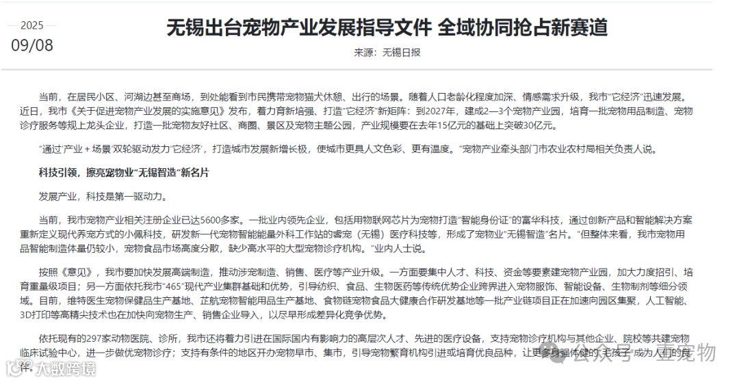 作为制造业强市,无锡市以《关于促进宠物产业发展的实施意见》为纲领,推动传统产业与生物医药领域的跨界融合。政策明确引导纺织、轻工等传统企业转型研发宠物服饰、智能佩戴设备、环保玩具等用品,并支持本地生物医药企业拓展宠物用生物制剂、特效药品及高端医疗设备研发 1 。这种"传统制造升级+精准医疗切入"的双轨模式,目标到2027年实现全市宠物相关产业规模突破30亿元,打造长三角地区宠物用品研发与高端医疗设备制造中心 。