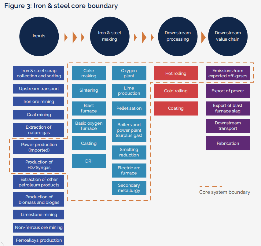 Sector specific target 的目标设定法为SDA(Sectoral Decarbonization Approach),和 Cross-sector target 不同, Sector specific target 的涵盖范围是固定的核心边界,钢铁行业核心边界如下: