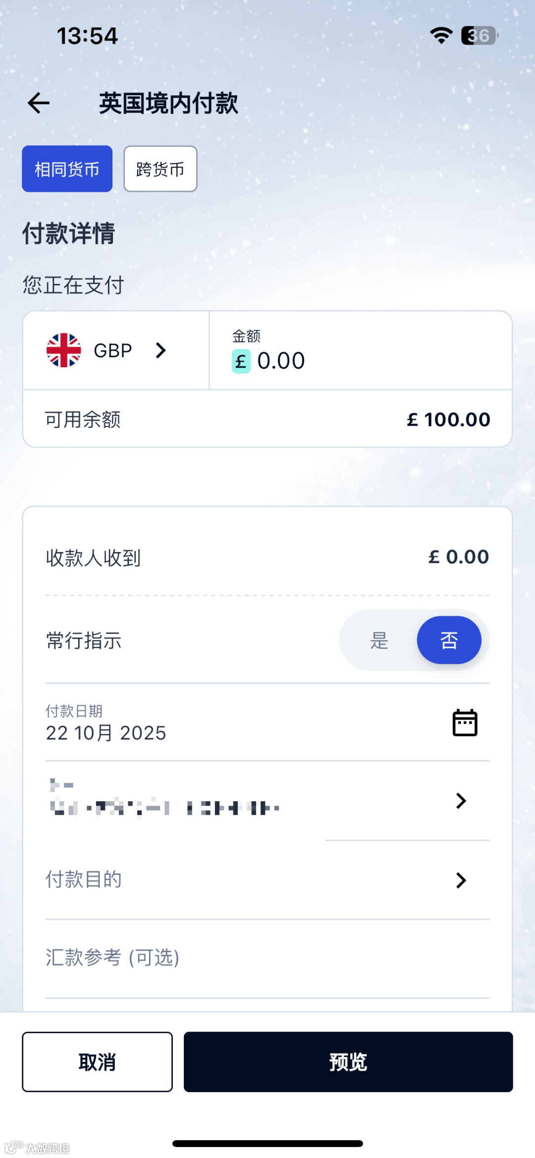 点击英镑账户,选择英国境内汇款,输入好需要转账的金额