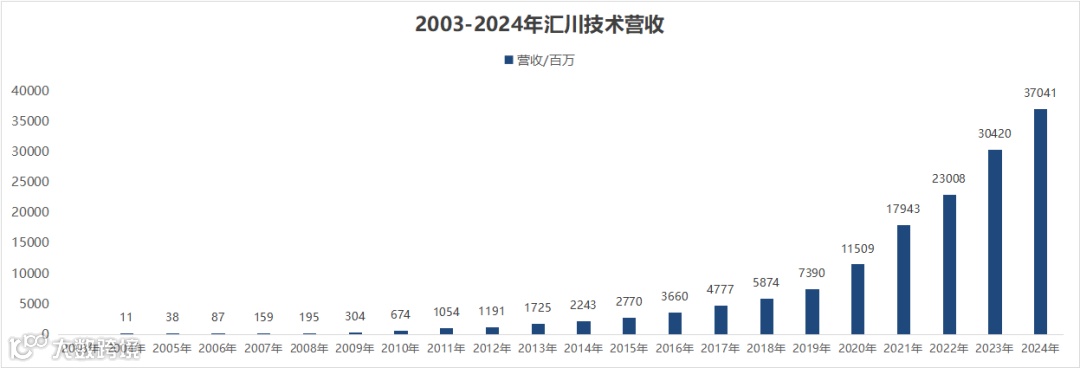 营收层面,汇川实现从千万到数百亿的跨越:2004年营收仅为1100万元,2010年突破10亿元并成功上市;2017年跨越50亿元;2021年逆势突破170亿元;2023年,全年营收已高达304.2亿元,年均复合增长率长期保持在40%以上。