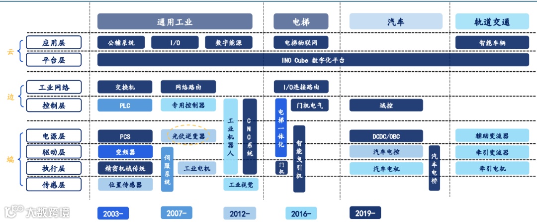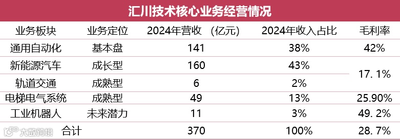 随着2015年全球乘用车电动化趋势日益明朗,汇川于2016年战略性切入新能源汽车领域,构建起通用自动化、电梯、新能源汽车与轨道交通的四大业务板块。