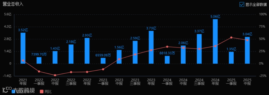 2025年半年报营业总收入为3.04亿元,相较于2024年半年报的2.06亿元,增长47.82%。