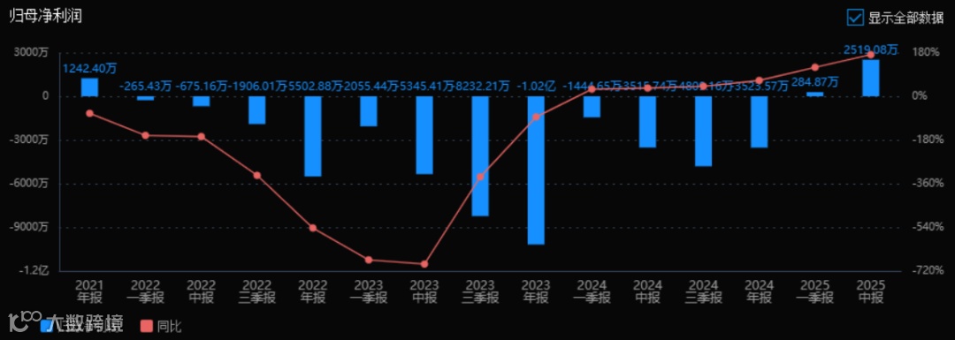 2025年半年报归母净利润为2519.08万元,相较于2024年半年报的-3515.74万元,实现扭亏为盈,同比增长171.65%。
