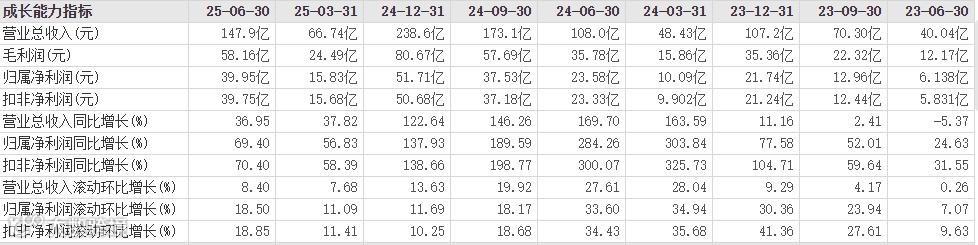 上半年实现营业收入147.89亿元,同比增长36.95%;归母净利润39.95亿元,同比大幅增长69.40%;扣非净利润39.75亿元,同比增长70.40%。