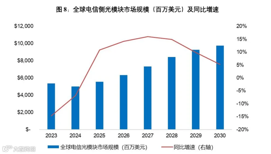 根据Lightcounting 测算,2026 年全球电信光模块市场规模将同比增长 14%至63亿美元,预计 2030 年市场规模有望达到97亿美元,对应年复合增长率11%,主要由于电信服务商对运营网络的迭代 升级等