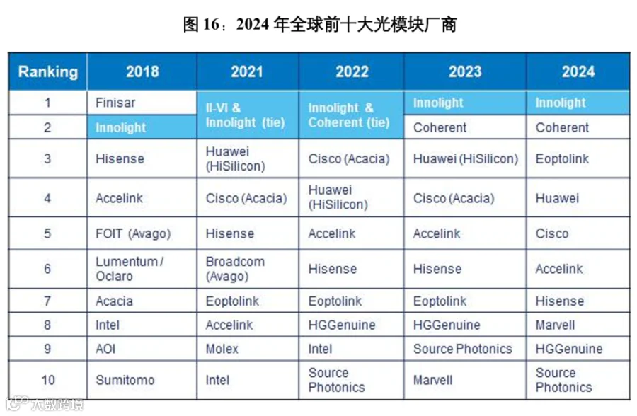 中际旭创出货量一直保持全球领先地位,但是新易盛发展非常迅猛,从2023年的第7位一举跃居到2024年的第二位。之后需要重点关注,会在之后的文章中重点分析。
