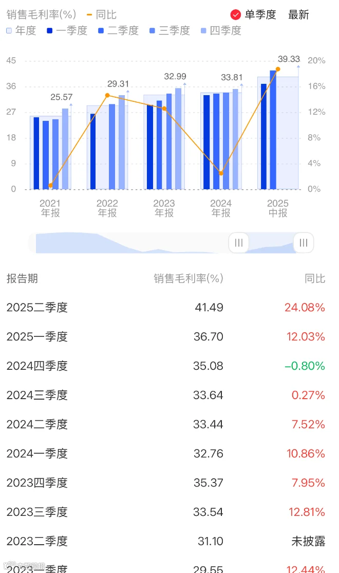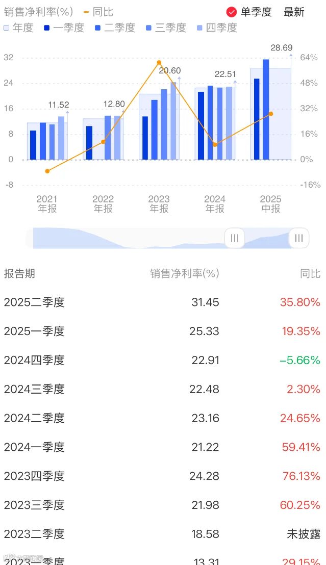 我们再看下毛利率和净利率情况,毛利率从23年1季度的29.55%逐渐提升到25年2季度的41.49%,毛利率的持续改善,说明公司产品的市场竞争力变强和市场持续变好。净利率上升趋势也很明显,到25年2季度,净利率达到了31.45%。如此高的净利率,说明公司市场竞争力极强。