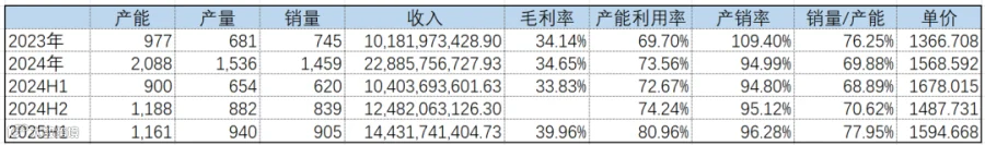 产能利用率和产销率都在提高,到25年上半年产能为1161万只,销售905万只,产能利用率77.95%。产品的平均单价25年上半年和24年比基本相当,但是毛利率比24年增长6个百分点,主要是800G产品占比增加,800G出货量大概450万只。25年下半年随着1.6T产品放量,单价和毛利率可能会有所提高,1.6T产品毛利率大概会在48%。
