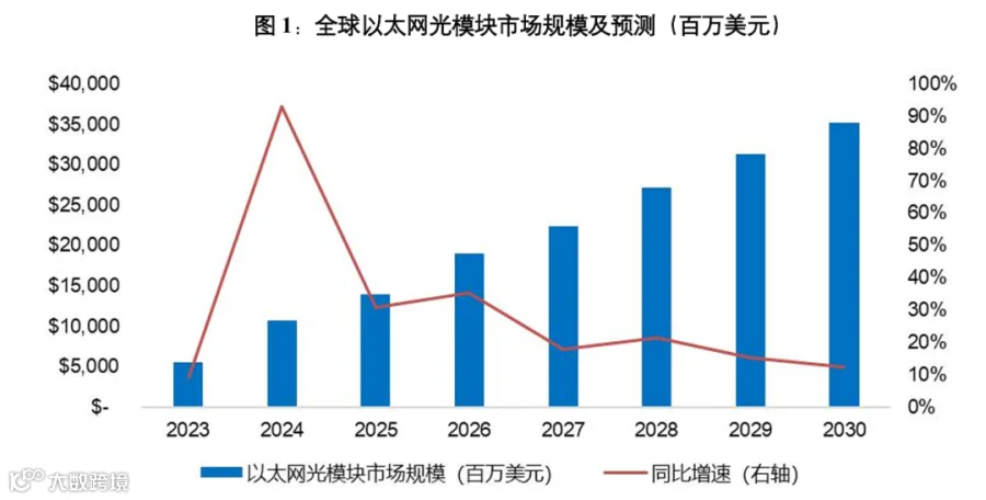 根据Lightcounting预测,全球以太网光模块市场规模有望持续快速增长,2026年将同比增长35% 至189亿美元,2027-2030年增速还将维持在双位数以上,2030年有望突破350亿美元。